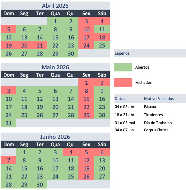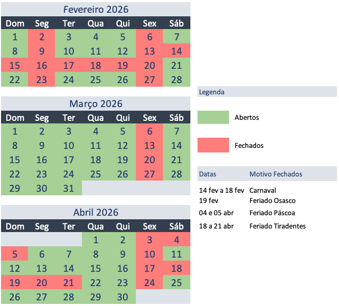 ATENÇÃO: NÃO ABRIMOS EM FERIADOS OU NOS FINAIS DE SEMANA DE FERIADOS PROLONGADOS.